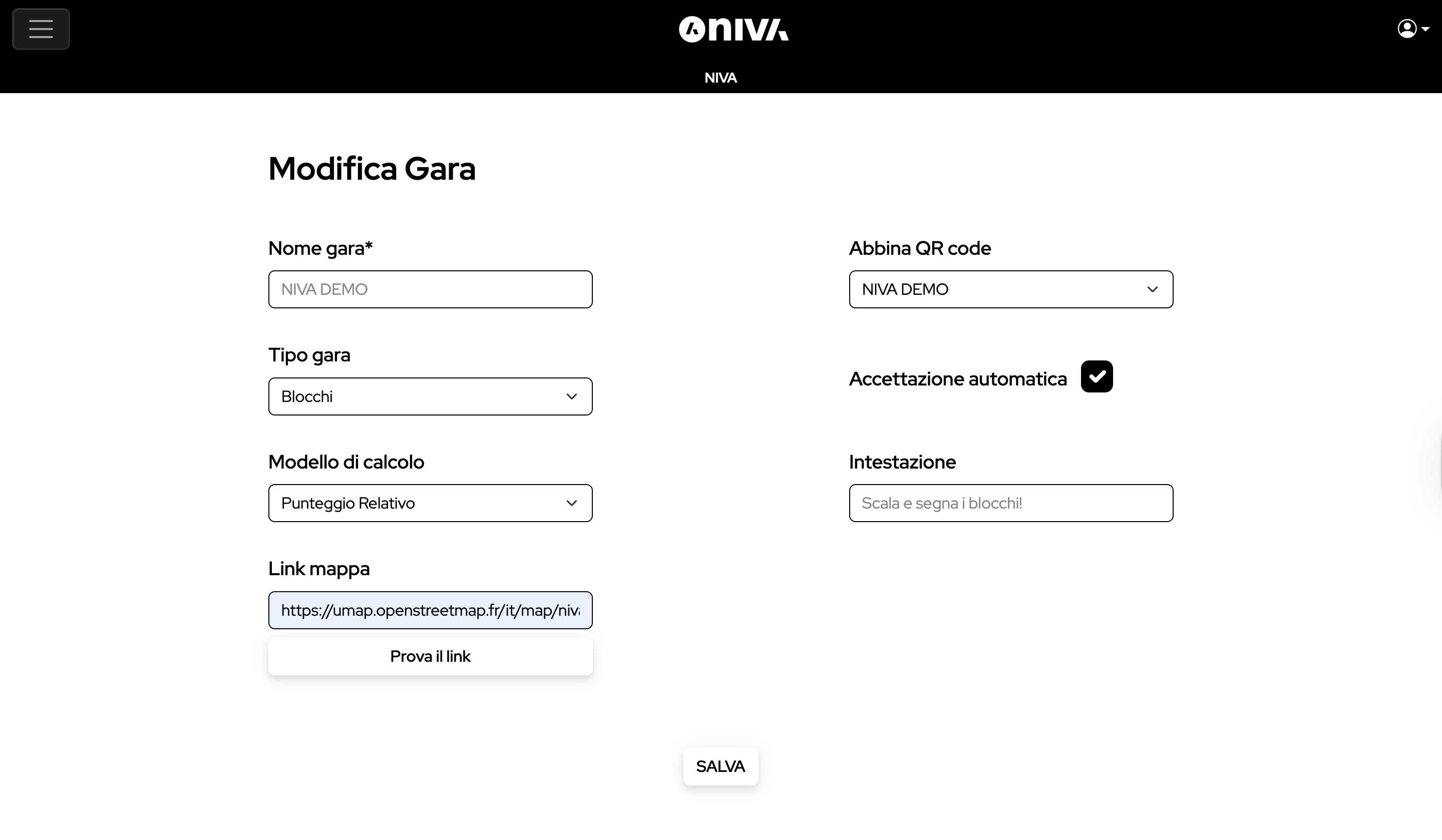 - Abbina QR code: puoi selezionare "Default" per crearne automaticamente un specifico per questa gara