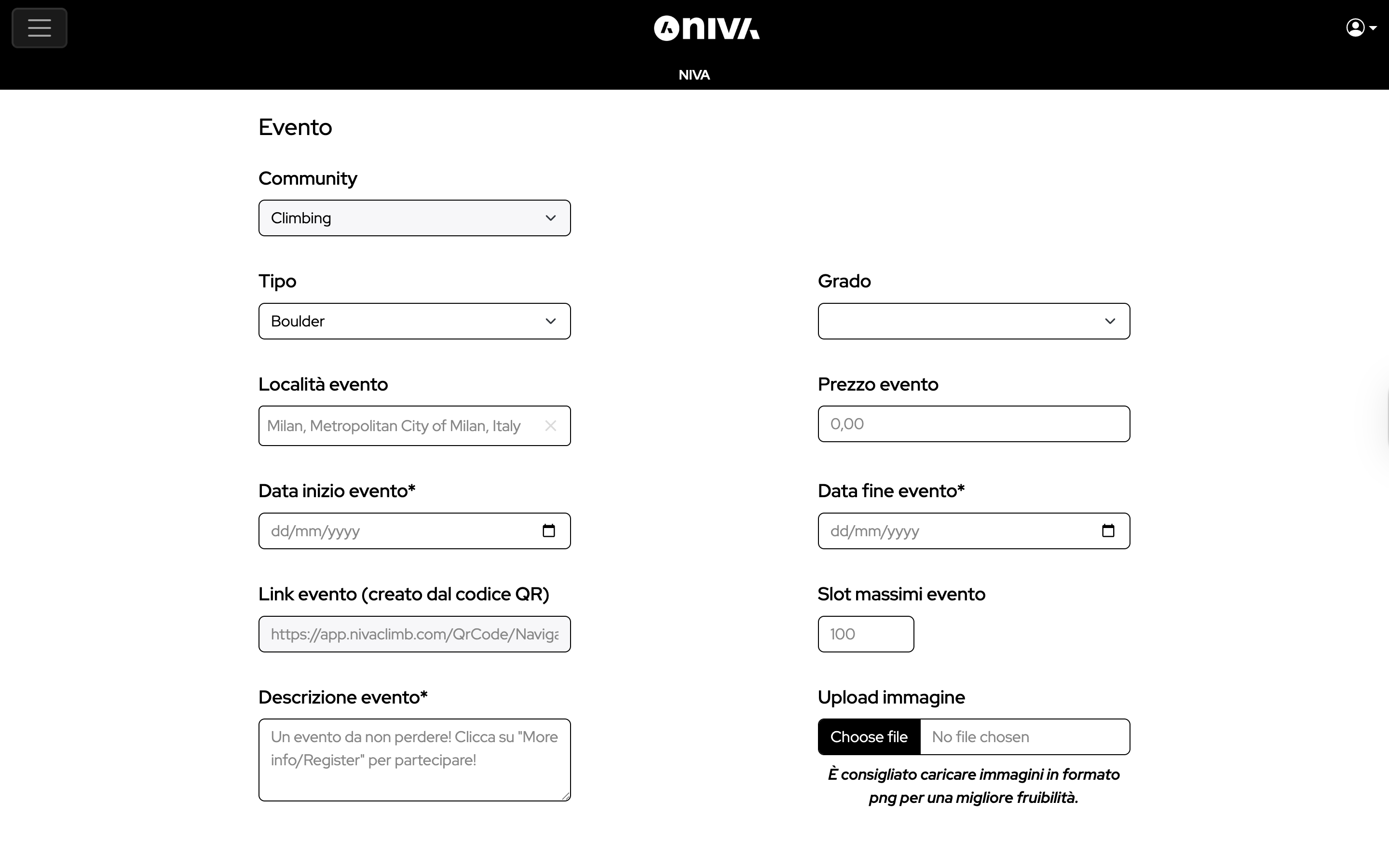 La compilazione di questa sezione permette inoltre di pubblicare automaticamente l'evento all'interno della app NIVA e quindi farlo scoprire a tutti gli utenti della community (+ di 15.000 climber!)