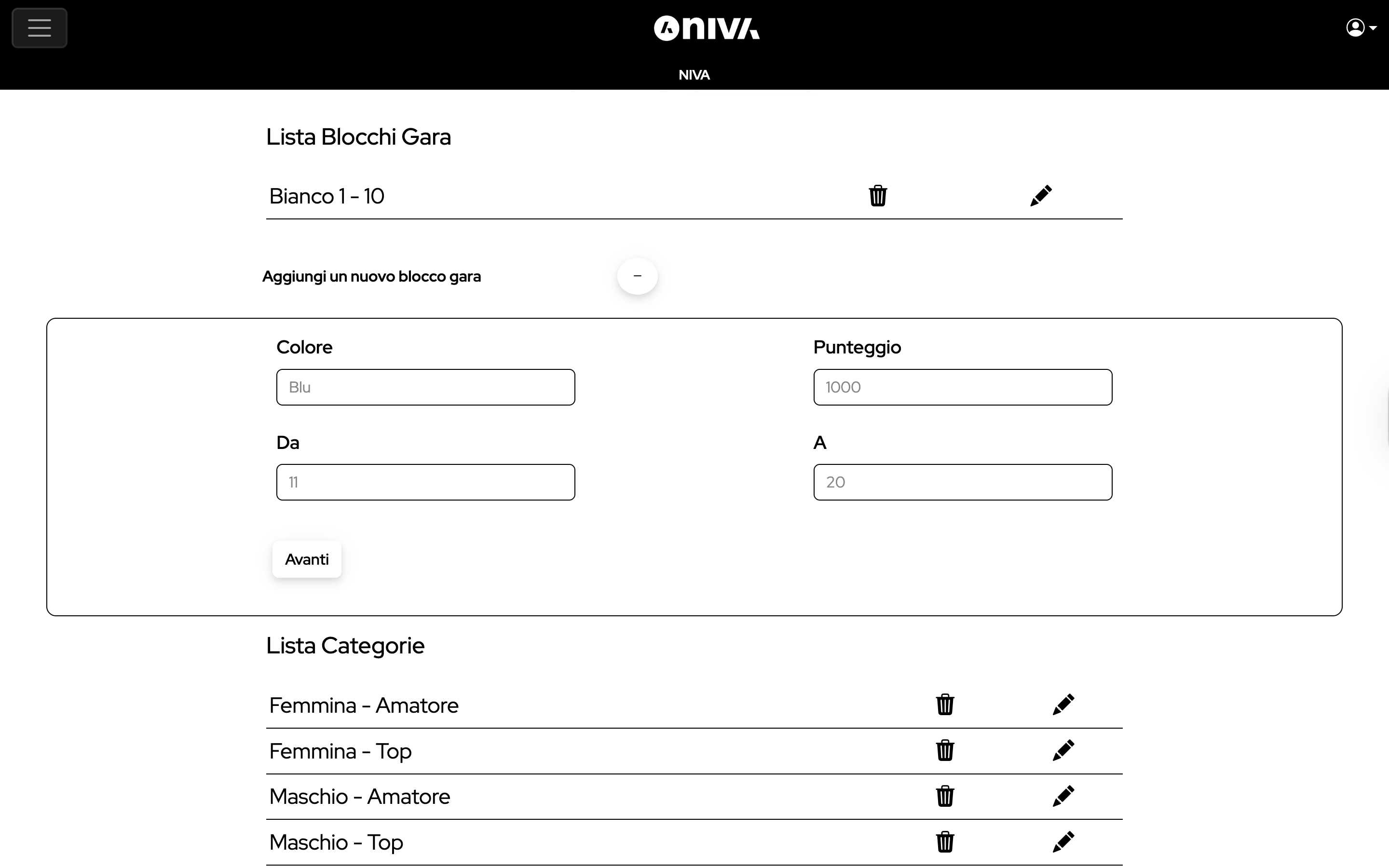 - Sezione “Lista Blocchi”: clicca sul “+” a fianco ad “Aggiungi un nuovo blocco gara” per creare un set di blocchi, indicando: