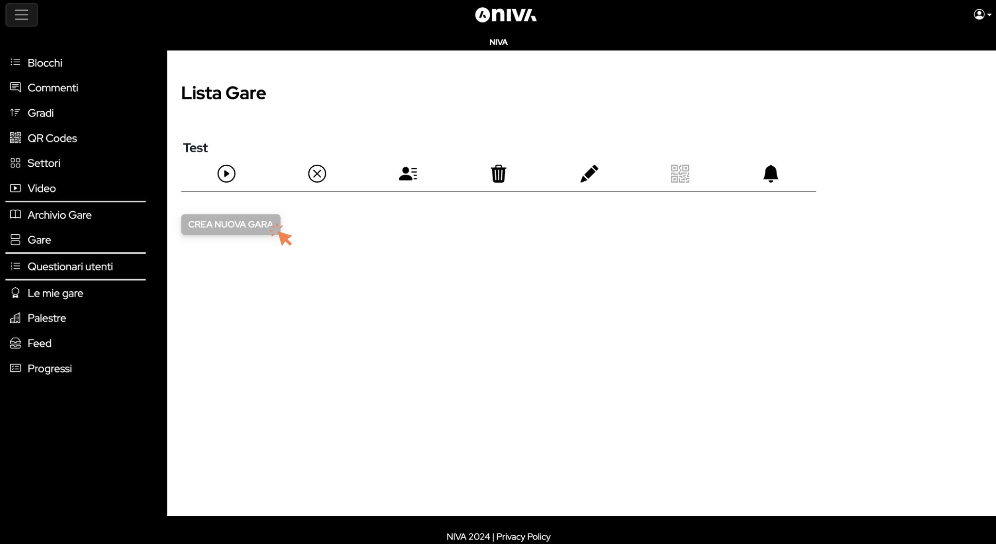 - Sezione “Gestione Gara”: per attivare, mettere in pausa e stoppare la gara