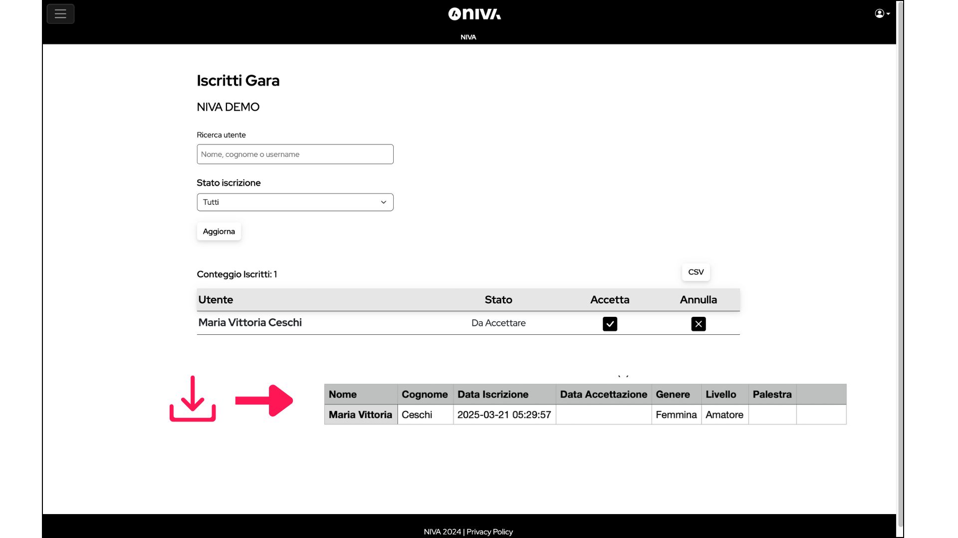 Puoi inoltre scaricare la lista degli iscritti in formato csv, cliccando sul pulsante "CSV". La lista conterrà le seguenti informazioni: